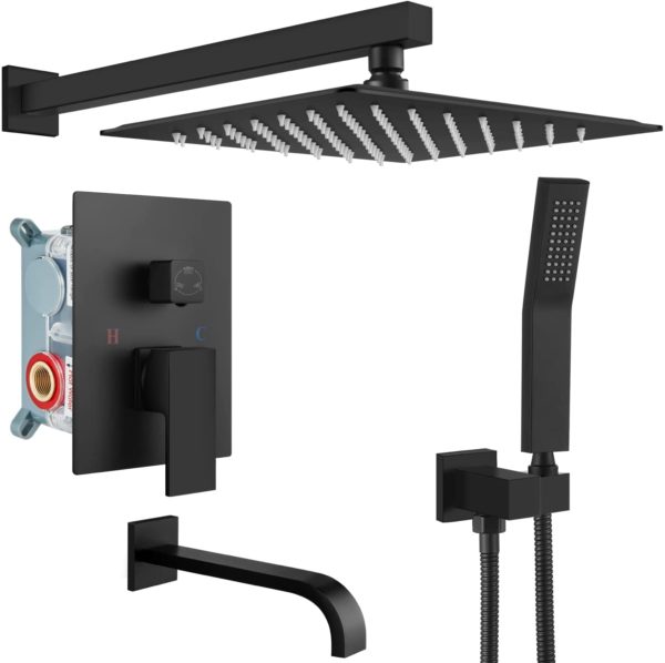 Package Contains: Shower head, Shower arm, Handheld shower holder, Handheld shower, Bathtub spout, Rough-in valve, all install hardware.