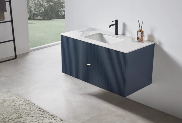 This 42” piece brings elegance, texture, and clean lines to your bathing space. Dark Blue or Forest Green colorways add a perfect balance of modern and organic sensibilities. Barcelona features a sturdy undermount style sink, as well as ample storage space for all bath necessities. The clean lines of the premium white sintered stone countertop balanced against the sophisticated texture of the vanity base contribute to an overall sense of elegance.