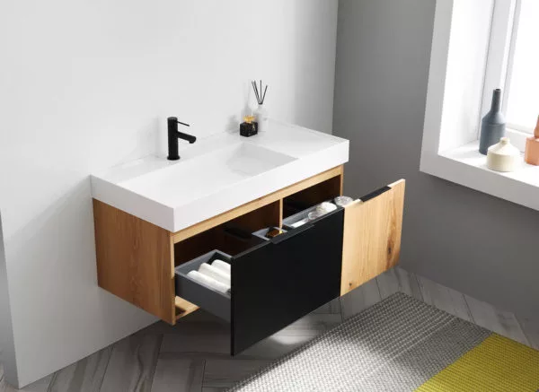 42” MATTE BLACK GLASS/MAPLE WALL MOUNT MODERN BATHROOM VANITY
