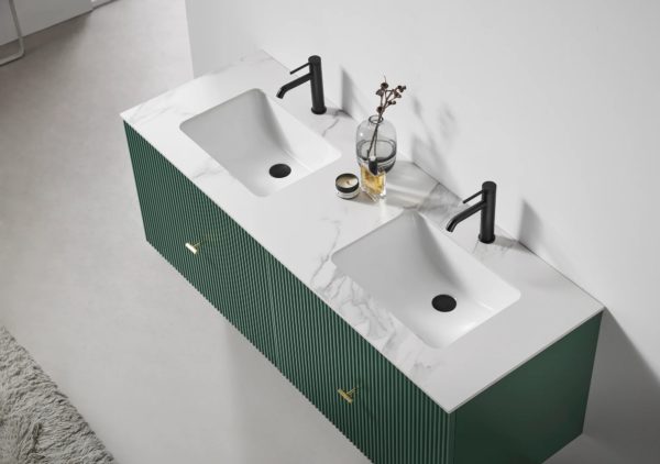 Dark Blue or Forest Green colorways add a perfect balance of modern and organic sensibilities. Barcelona features two sturdy undermount style sinks, as well as ample storage space for all bath necessities. The clean lines of the premium white sintered stone countertop balanced against the sophisticated texture of the vanity base contribute to an overall sense of elegance.