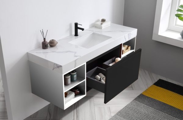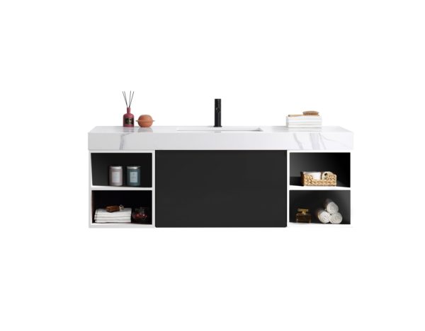 60” MATTE BLACK WITH THICK QUARTZ WALL MOUNT MODERN BATHROOM VANITY (OPEN SHELVES)