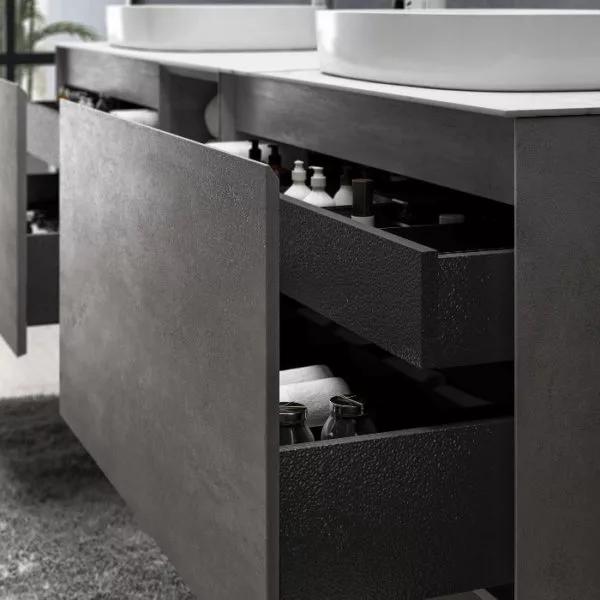 - Design: Italian porcelain slab countertop with marble grain. Unique multiple drawers design – big drawer with a concealed inner drawer, providing extra storage space.