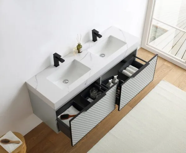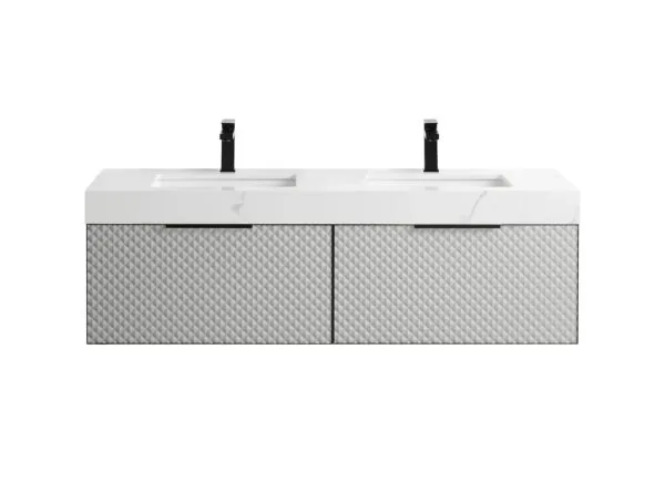 The unique geometric pattern adds texture and dimension to the elegantly designed piece. Two spacious, soft-closing drawers open to reveal ample storage space for your bath essentials. Minimalist handles and a thick, luxurious countertop add the perfect finishing touches. This vanity combines contemporary style and engaging texture to create a high quality bath experience.
