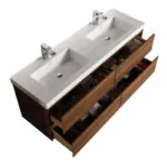 - Handle-free design with miter-cut edges and soft-closing drawers.