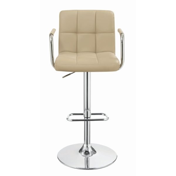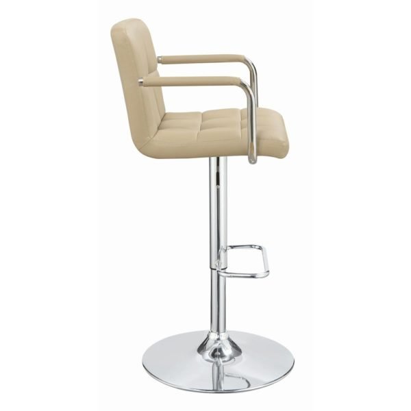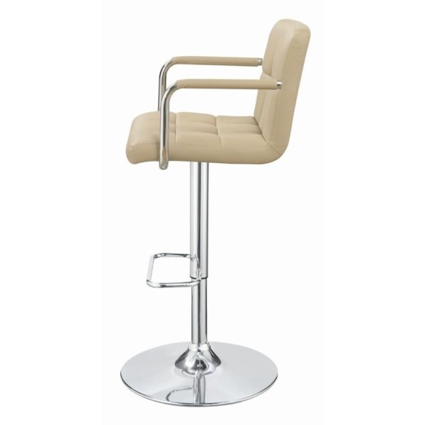 Casual sophistication and a comfortable seating experience await with this sleek contemporary beige adjustable bar stool. Choose a perfect height setting and relax in a nicely padded faux leather seat unit and enjoy armrests and a pole frame and footrest fashioned from chrome finish metal.