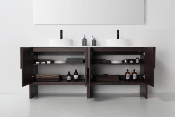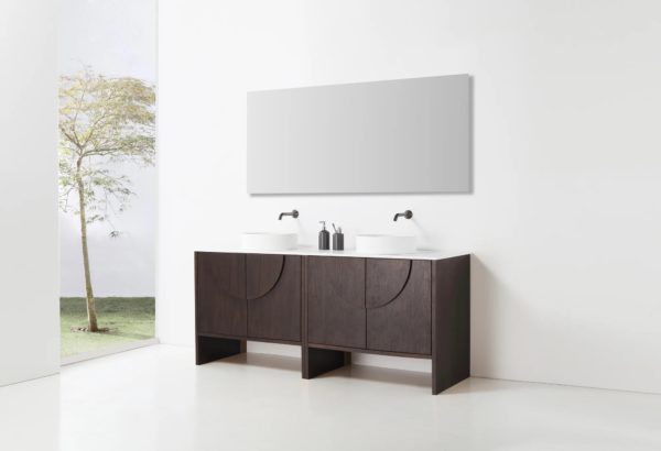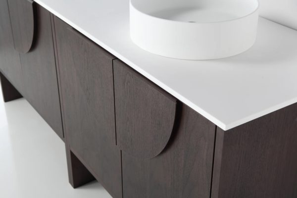 Available in 36″/72″ Pecan Oak/Dark Walnut. Celle combines elegant curves and straight lines to create a contemporary and classic piece of furniture. The doors open to reveal a generously sized two-shelf cabinet, with plenty of storage space. The cool white circular sink artistically mirrors the detailing on the front doors, while a pristine white countertop completes the piece.