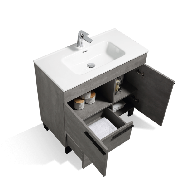- 【MODERN LTALIAN DESIGN BATHROOM VANITY SET WITH SINK】The 24-inch GILL bathroom vanity comes with Matte grey cabinet and Glossy white Counter Sink (WITHOUT FAUCET & MIRROR) which will be perfect for your modern bathroom. Bathroom vanity cabinet dimensions are 23.8″L x 17.9″W x 28.3”H.