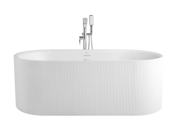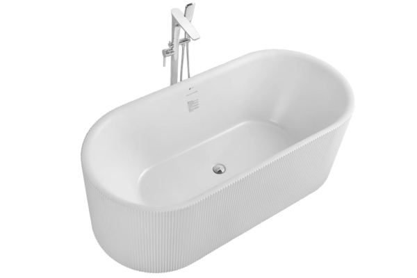 Transform your bathroom into a luxurious spa-like retreat with this modern freestanding bathtub featuring an elegant ribbed exterior design. Its clean oval silhouette combined with vertical textured lines creates a striking architectural look that enhances both contemporary and minimalist bathroom interiors.
