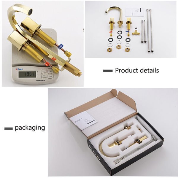 Type – Bathroom Faucet; Feature – Metered Faucet; Surface Treatment – Polished; Color – Gold; Faucet Mount – 4″; Installation Type – Deck Mounted; Number of Handles – Dual Handle; Style – Contemporary; Valve Core Material – Brass; Material – Brass and Zinc Alloy; Water Pressure Testing – 1.6 Mpa; Air Pressure Testing – 0.6 Mpa; Cartridge Life Time: 500000 times open and close