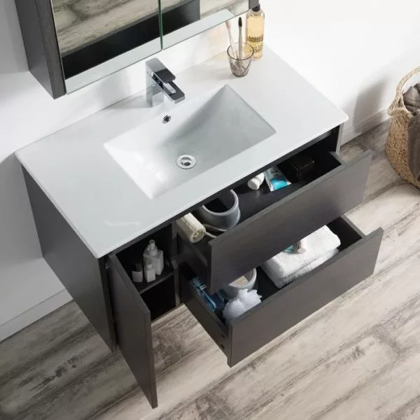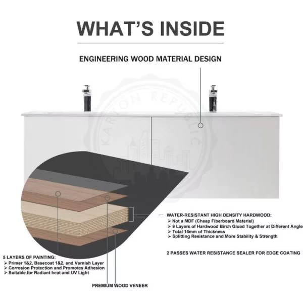 - Vanity Base Materials: 9 Layers of High Density Hardwood; 15mm of Thickness; Water-resistance; Splitting Resistance and More Stability & Strength.