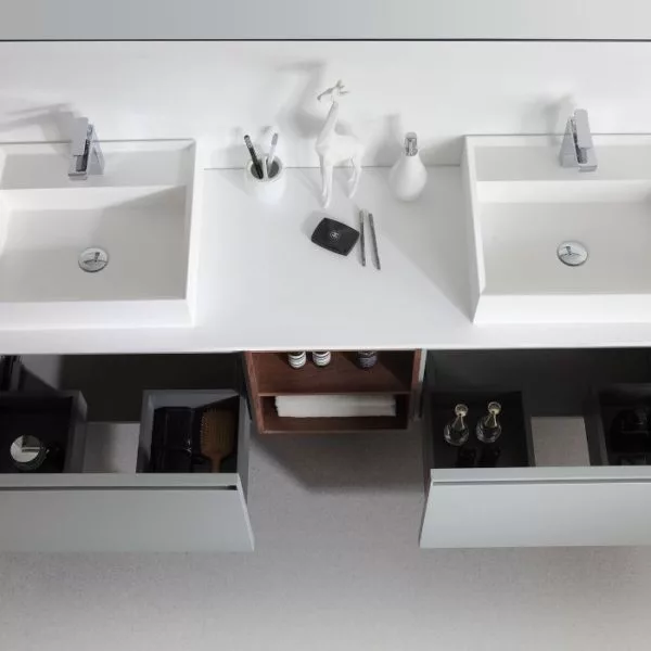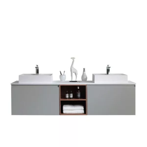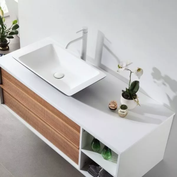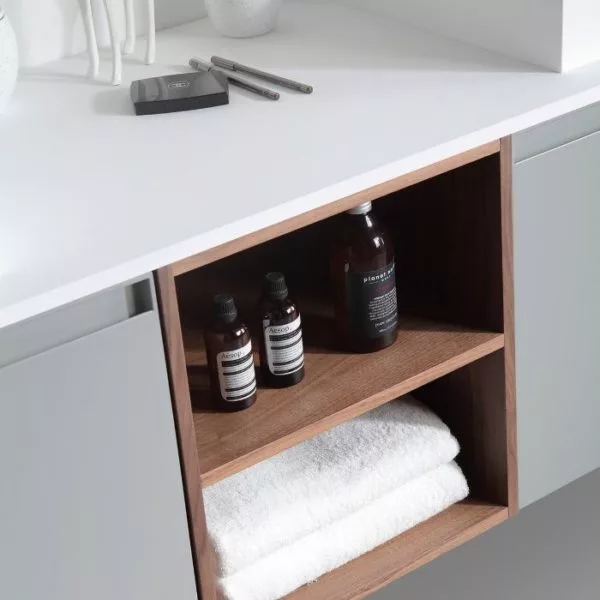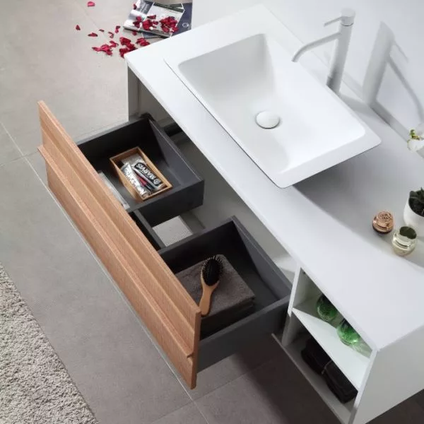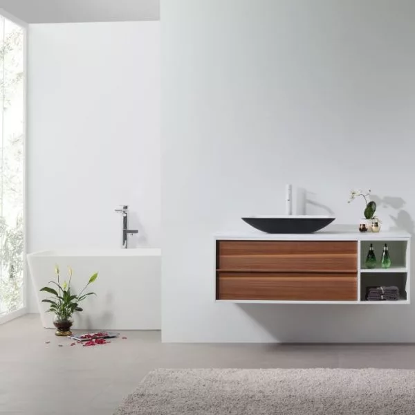 This modern artistic characterizes the 48-inch Walnut/white Goreme series. Featuring walnut/white finishing, this wall mounted piece boasts two drawers with natural wood texture and open shelves with enough storage space in style. Pure white countertop mixes with unique acrylic top-mount sink. The characteristic of Goreme series provides outstanding and fashionable bath space and well-matching with other bathroom fixtures.