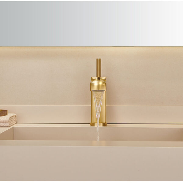 The warm brushed gold finish adds a sophisticated accent while resisting corrosion and maintaining its beautiful shine over time. Designed for smooth water flow and easy temperature control, this faucet delivers both comfort and performance.