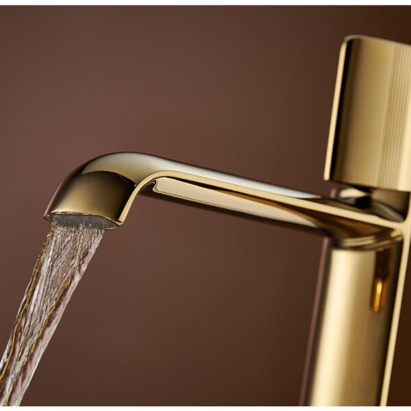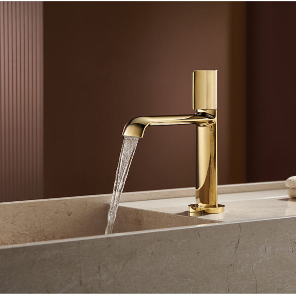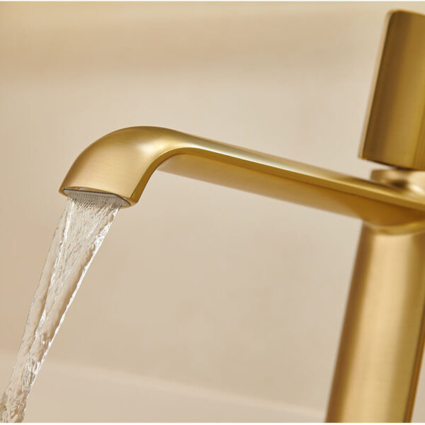 Elevate your bathroom with this elegant modern brushed gold faucet, designed to combine contemporary style with everyday functionality. The smooth curved spout and sleek cylindrical handle create a refined minimalist look that complements both modern and luxury bathroom interiors.
