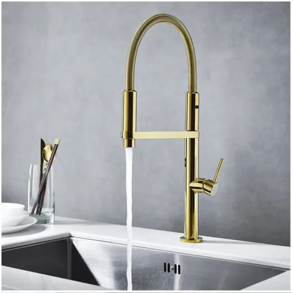 Bring elegance and modern functionality to your kitchen with this luxury pull-down kitchen faucet in brushed gold finish. Designed with a sleek cylindrical body and a flexible high-arc spout, this faucet adds a sophisticated and contemporary touch to any kitchen space.