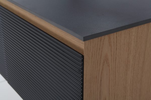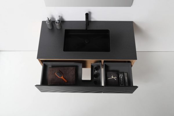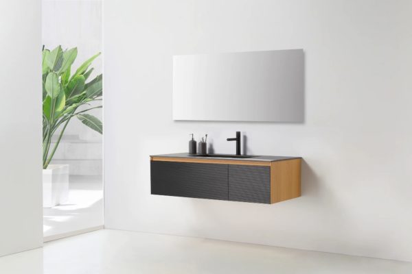 This sleek, dark-toned vanity, available in 48″ and 60,” adds a sense of tidiness and sharp sophistication to your bathing space. The front is textured with unique ridges, and the spacious drawers open to reveal plenty of storage for your bath essentials. The natural wood tone perfectly balances the matte black portion of the vanity. Perfect for a variety of spaces.