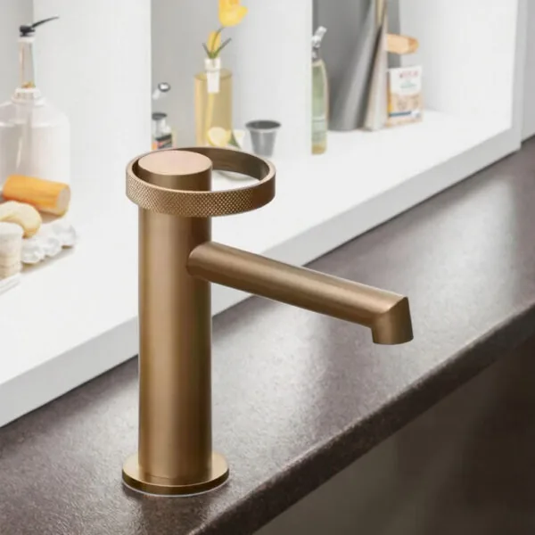 Add a bold and sophisticated accent to your bathroom with this modern brushed bronze faucet. Designed with a sleek cylindrical body and a clean horizontal spout, this faucet blends minimalist design with unique detailing. The distinctive circular knurled handle not only enhances the modern aesthetic but also provides a comfortable grip for smooth and precise water control.