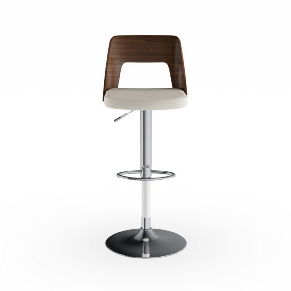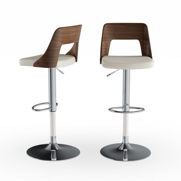 Complement your contemporary kitchen decor with this sleek barstool . Constructed from chrome-finished metal, the base swivels 360 degrees and adjusts to fit your height needs. The open walnut-finished seat back offers support and the plush seat is upholstered in black or white faux leather for a modern finish.