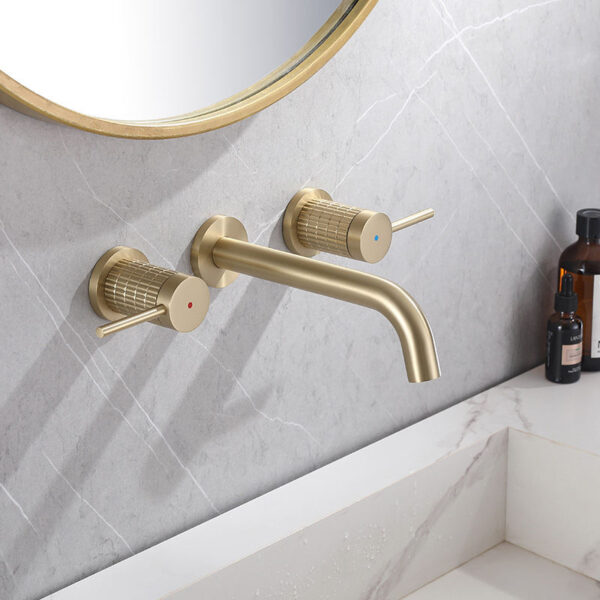 Create a clean and sophisticated bathroom design with this modern wall-mounted brushed gold faucet. Featuring sleek cylindrical shapes and elegant knurled handles, this faucet combines minimalist aesthetics with refined detailing.