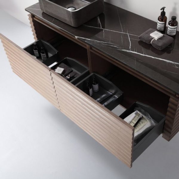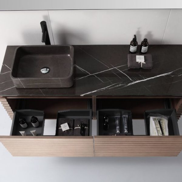 Featuring original chestnut wood pattern and black forest quartz countertop with vessel sink, Ocala boasts elegant and designable folding vanity surface. Its two wide drawers give users large storage space. Detail means everything. The combination of chestnut solid wood base and stone countertop brings us a best feeling of luxury enjoyment.