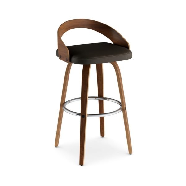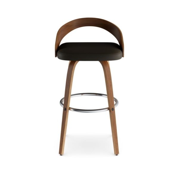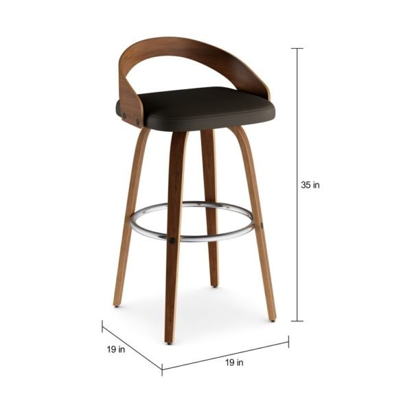 Constructed from wood and veneer, the sleek walnut-finished frame features a low seat back for support and a chrome footrest for comfort. The plush round seat is upholstered in espresso faux leather for a touch of modern style.