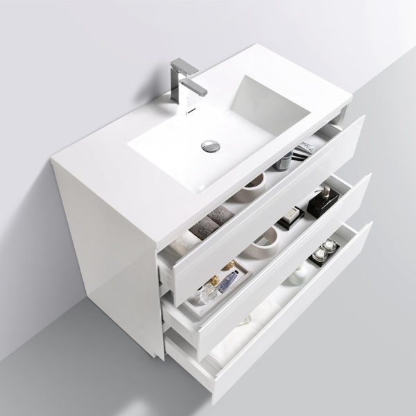 Freestanding bathroom vanity has a high-end white artificial stone integrated countertop with sink. With the U shaped drawers, the cabinet has plenty of storage space for all of your washing items. The freestanding feature makes the vanity flexible.
